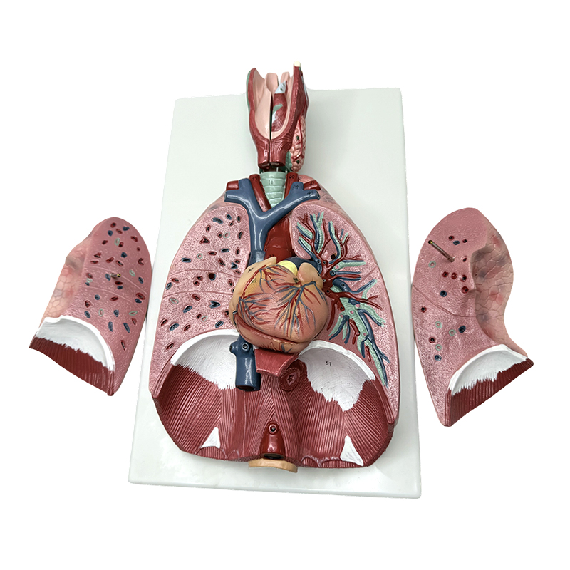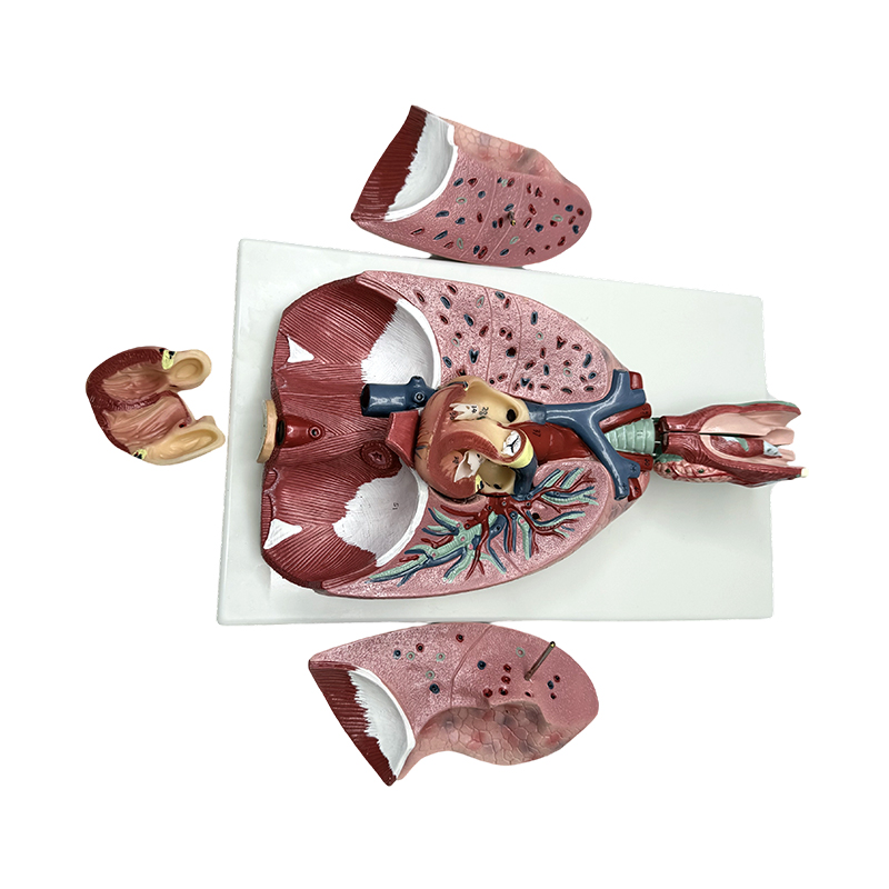 This model is natural size, divided into 7 parts, the two lobes of the lung can be removed to show its internal structure, the heart is cut longitudinally to show the atrium, ventricle and valve, and the larynx is also divided into two parts and placed on the base.